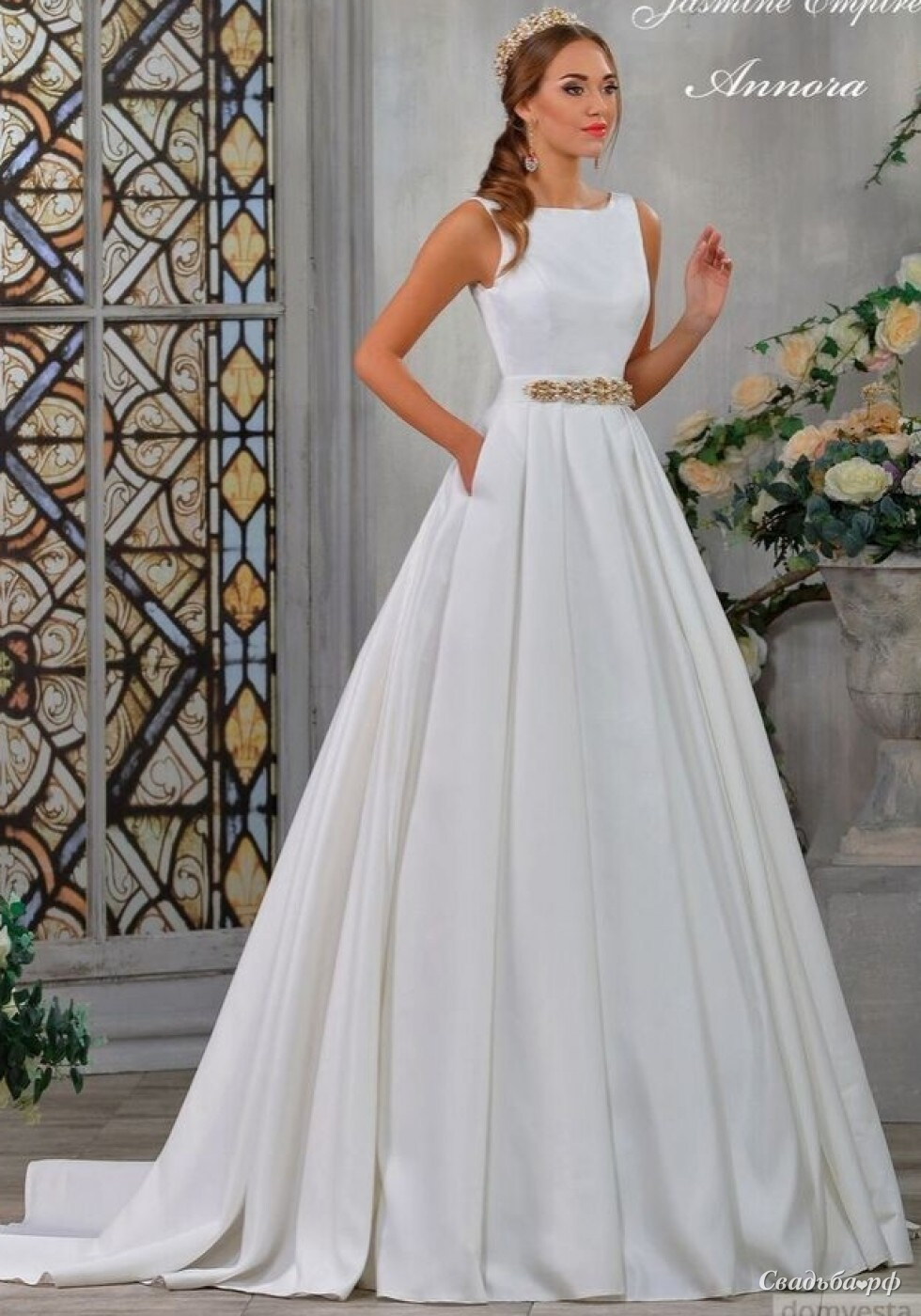 Оригинальное закрытое свадебное платье А-силуэта с застежкой на молнии и пуговками на спинке. Элегантный и изысканный образ, линия талии подчеркнута поясом ручной работы из жемчуга, стекляруса и кристаллов Swarovski.