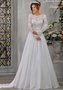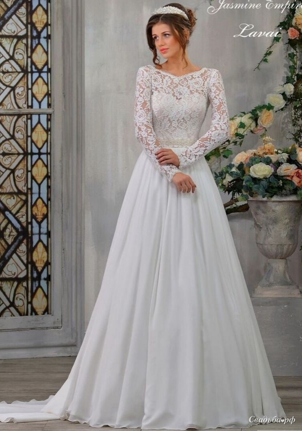 Очень нежное свадебное платье А-силуэта с небольшим шлейфом и длинными рукавами. Корсет украшен красивым кружевом с петельным узлом. Линия горловины и манжеты рукавов расшиты жемчугом и стеклярусом. Талия эффектно подчеркнута атласным поясом с роскошным кружевом. Юбка с легкими драпировками завершает образ.