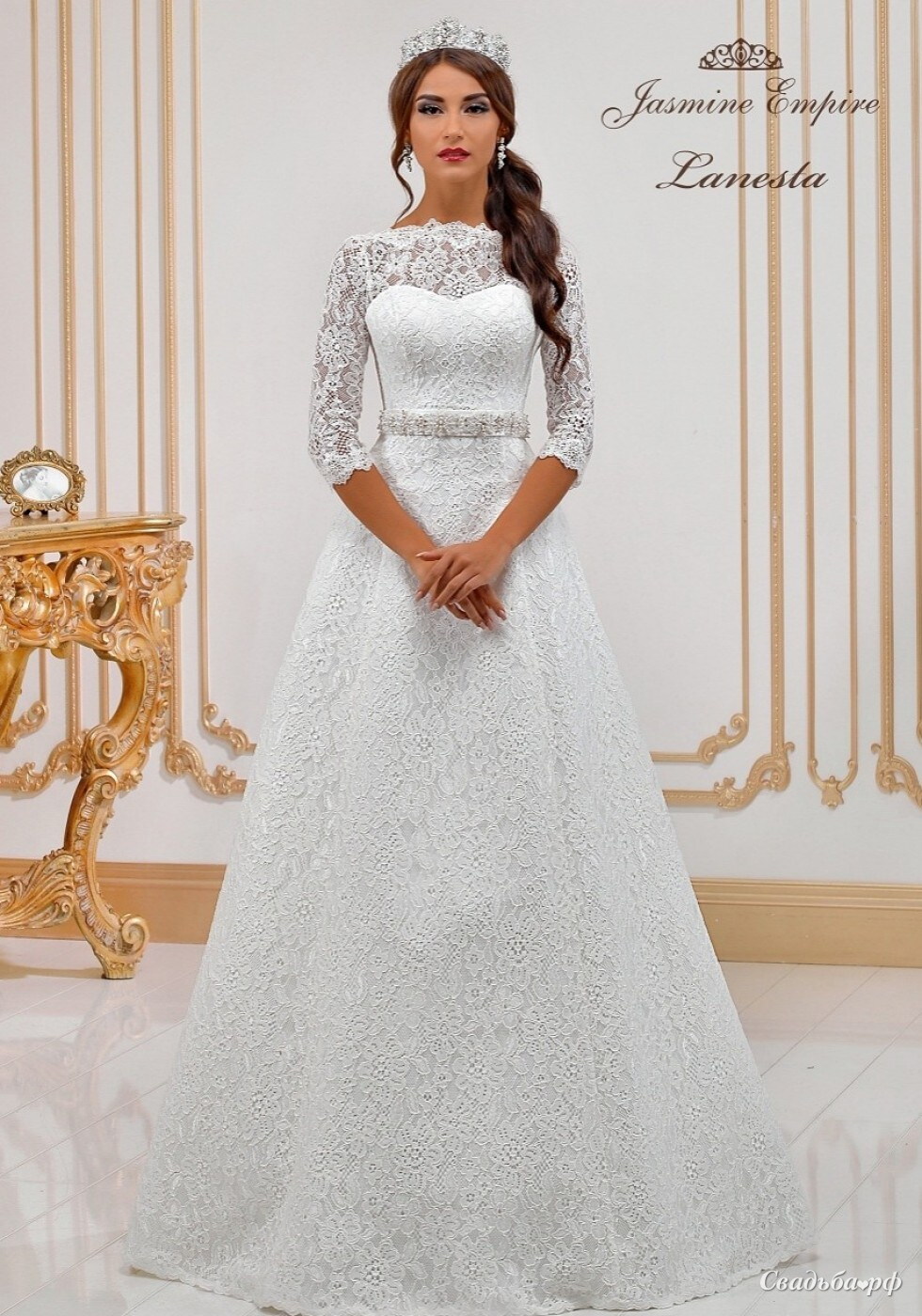 Эффектное свадебное платье А-силуэта из французского кружева. Модель дополнена полупрозрачными кружевными рукавами ¾. На спинке эффектный V-образный вырез. Корсет на шнуровке. Линия талии элегантно подчеркнута атласным поясом, вручную расшитым жемчугом, кристаллами Swarovski и стеклярусом.