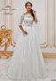 Необыкновенно нежное и женственное свадебное платье А-силуэта с закрытой спинкой и длинными рукавами. Корсет украшен нежным цветочным кружевом. Лиф и манжеты рукавов по краю расшиты маленькими жемчужинами. Спинка декорирована маленькими атласными пуговками. Талия выделена вышивкой ручной работы. Юбка из воздушного мультишифона завершает образ.