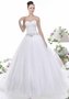 Классическое свадебное платье с пышной юбкой. Открытый корсет с сердцевидным вырезом лифа украшен нежным романтичным кружевом. Заниженная линия талии выделена широким атласным поясом, расшитым стразами. Пышная юбка из нежнейшего фатина завершает образ.