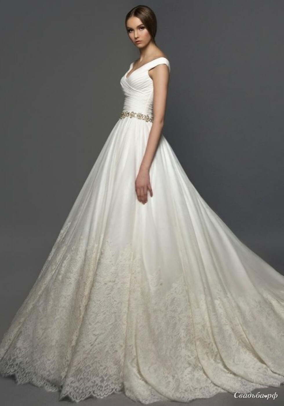 Невероятное свадебное платье с приспущенными плечиками. Нежная драпировка украшает корсет модели и подчеркивает изящность фигуры. Красивая расшивка делает акцент на талии. Пышная юбка по канту декорирована изысканным кружевом.