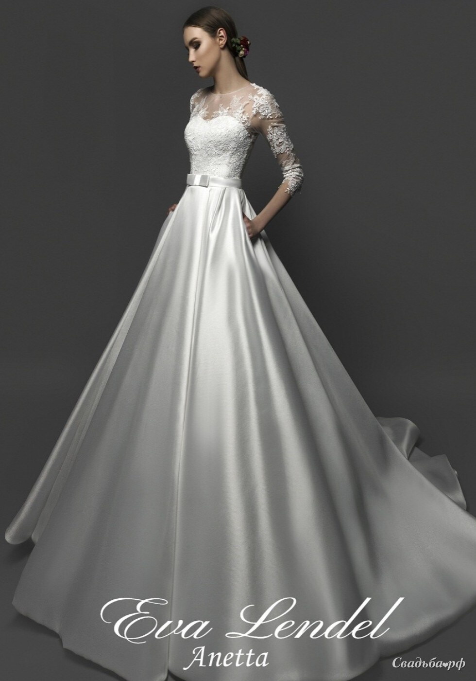Шикарное закрытое свадебное платье не оставит равнодушной ни одну невесту. Корсет расшит потрясающим кружевом, закрывающим руки и спинку. Атласный пояс с бантиком акцентирует внимание на изящной талии. Простая атласная юбка с легкими складками дополнена стильными карманами.