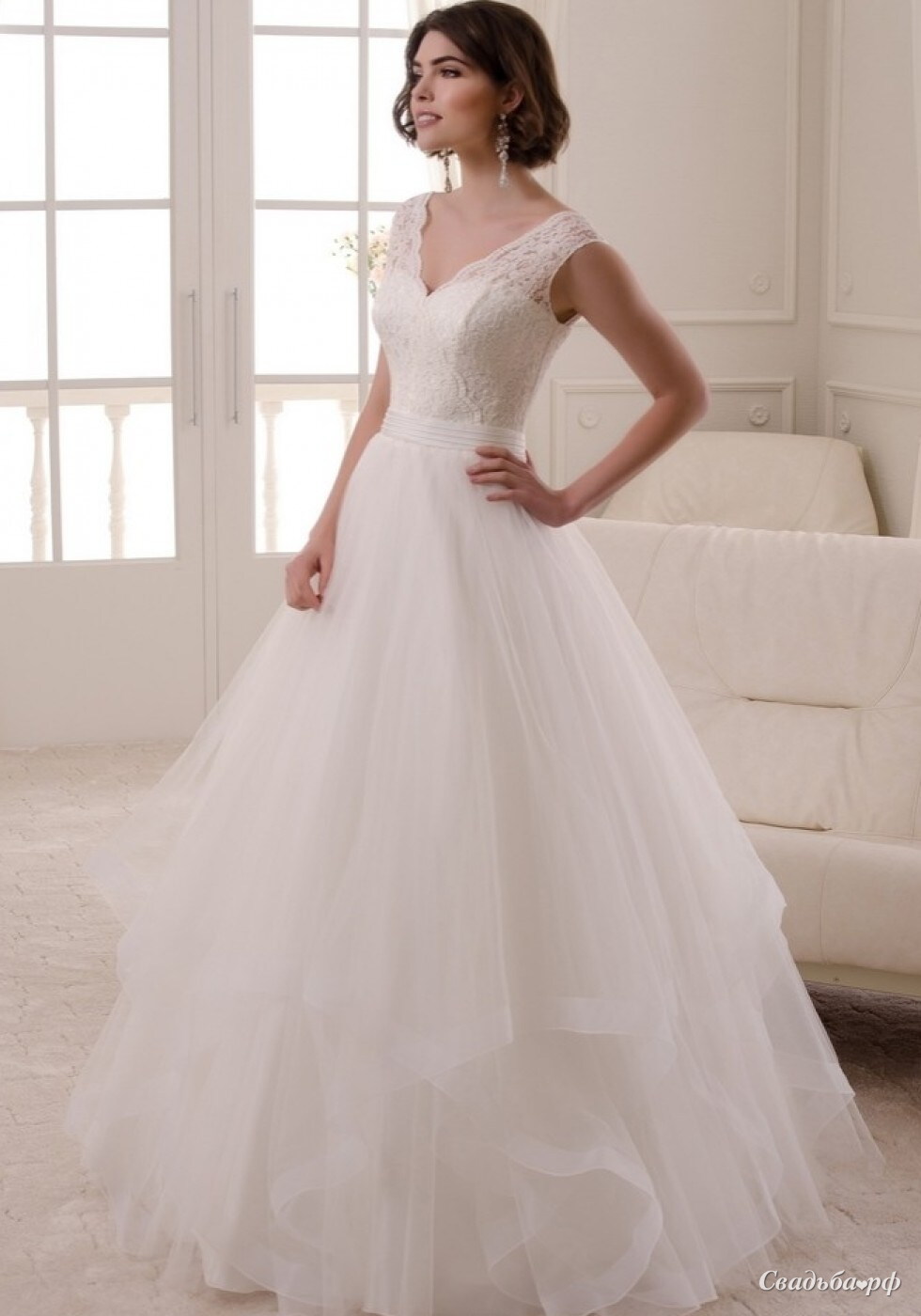 Очень нежное свадебное платье на широких лямках со струящейся юбкой. Модель эффектно подчеркивает фигуру. Изящное кружево украшает корсет. Плиссированный пояс подчеркивает талию. Роскошная юбка с оригинальными ярусами завершает образ.