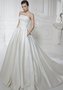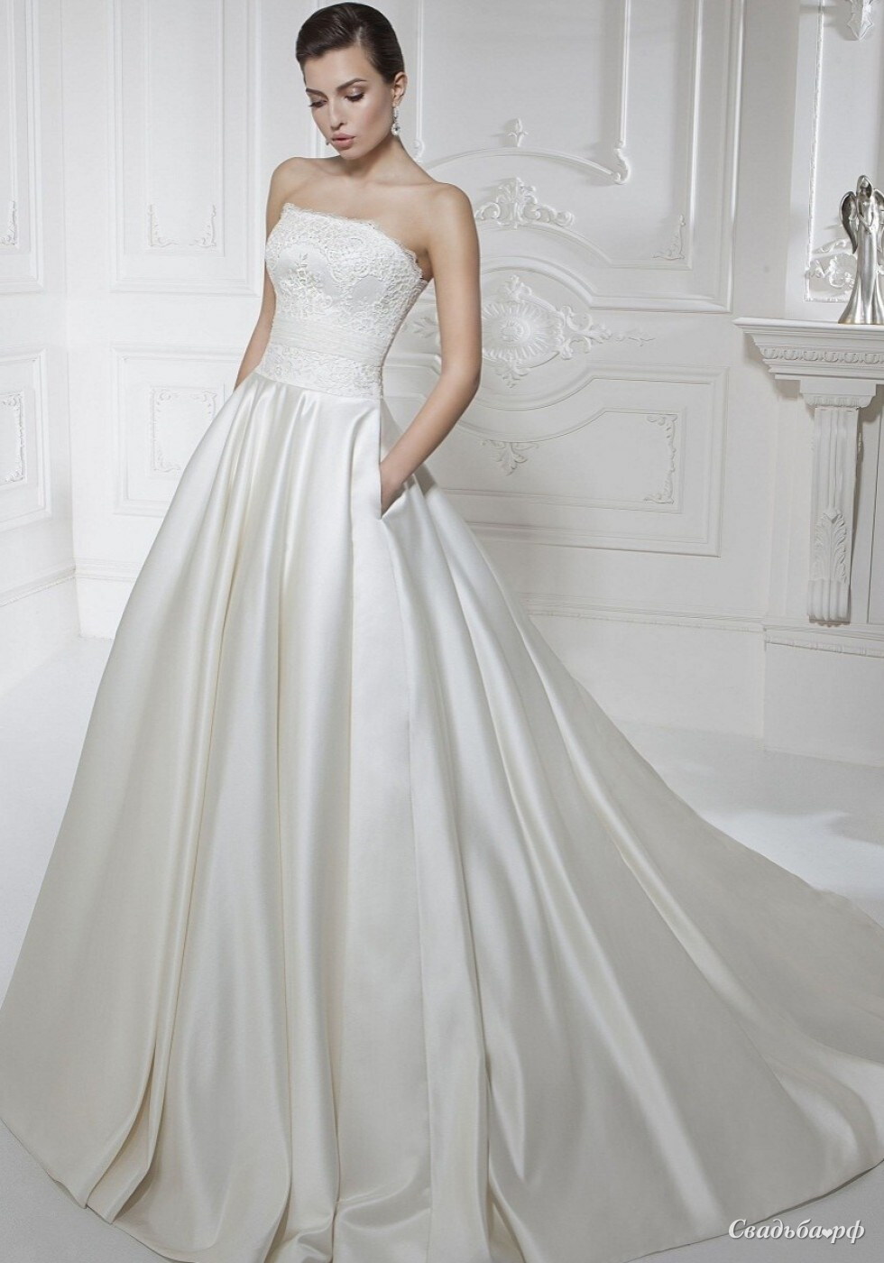 Потрясающее свадебное платье из роскошного атласа. Корсет модели отделан тончайшим кружевом с изумительно красивой сверкающей вышивкой. Линия талии подчеркнута широким поясом из фатина. Юбка со складками переходит в длинный шлейф, превосходно завершающий образ.