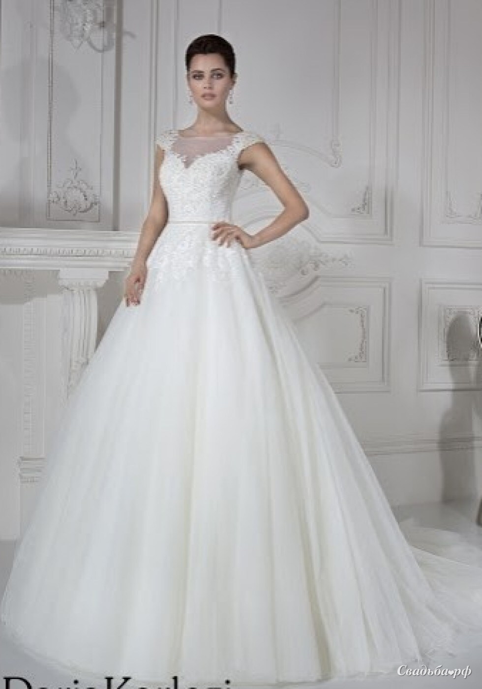 Свадебное платье из легкого фатина. Корсет расшит кружевом, закрытой зоной декольте и маленькими изящными рукавчиками. Спинка модели обрамлена кружевами и декорирована маленькими пуговками. Тонкий поясок из страз Swarovski подчеркивает талию. Веточки кружева спускаются по верхней части юбки.