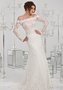 Элегантное свадебное платье силуэта рыбка отличается изяществом и отсутствием излишеств. Расшивка на талии и кружевная ткань придают образу шик. Корсет с закрытой зоной декольте дополнен длинными рукавами. Плечики открыты, вырез изящной лодочкой. Спинка полностью закрыта. От середины бедра юбка слегка расширяется и переходит в шлейф.