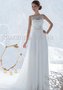 Шифоновое свадебное платье в греческом стиле с закрытой расшитым кружевом зоной декольте. На талии затейливая расшивка из жемчуга, бисера и пайеток. Спина наполовину закрыта легким прозрачным тюлем с расшивкой кружевом в зоне плечиков. Корсет на шнуровке.