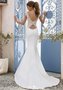 Изящное и стильное свадебное платье в стиле рыбка. Полупрозрачный корсет с необычным кружевом дополнен широкими бретелями. Спинка модели почти полностью обнажена. Длинная атласная юбка великолепно подчеркивает достоинства фигуры и переходит в шлейф.