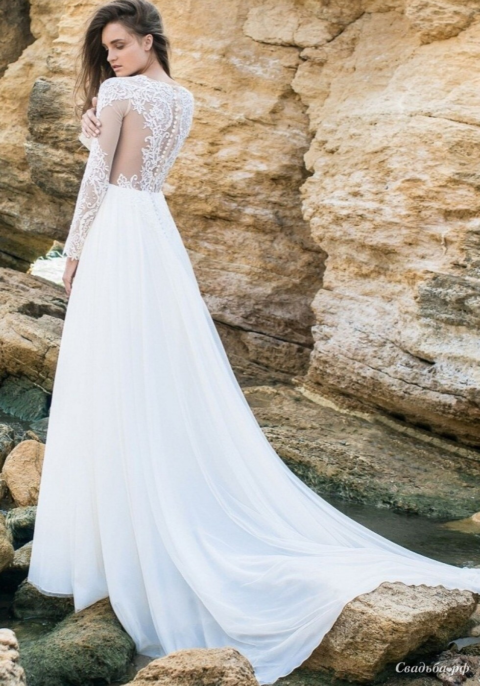 Оригинальное закрытое свадебное платье с закрытой спиной, длинными рукавами и длинным шлейфом привлечет взгляды окружающих. Эффектное кружево украшает корсет, рукава и полностью закрывает спинку, вдоль средней линии которой - изысканные пуговки. В этом наряде вы почувствуете себя настоящей Богиней.