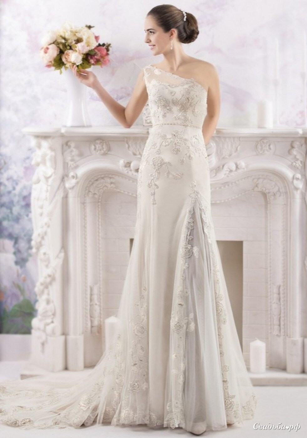 Оригинальное и элегантное свадебное платье отличается безупречными формами и королевской сдержанностью. Вырез лифа дополнен бретелью на одно плечо. Наряд расшит роскошными кружевными аппликациями. Плетеный поясок подчеркивает талию. Юбка красиво облегает бедра, расширяясь от середины бедра и переходя в небольшой шлейф.