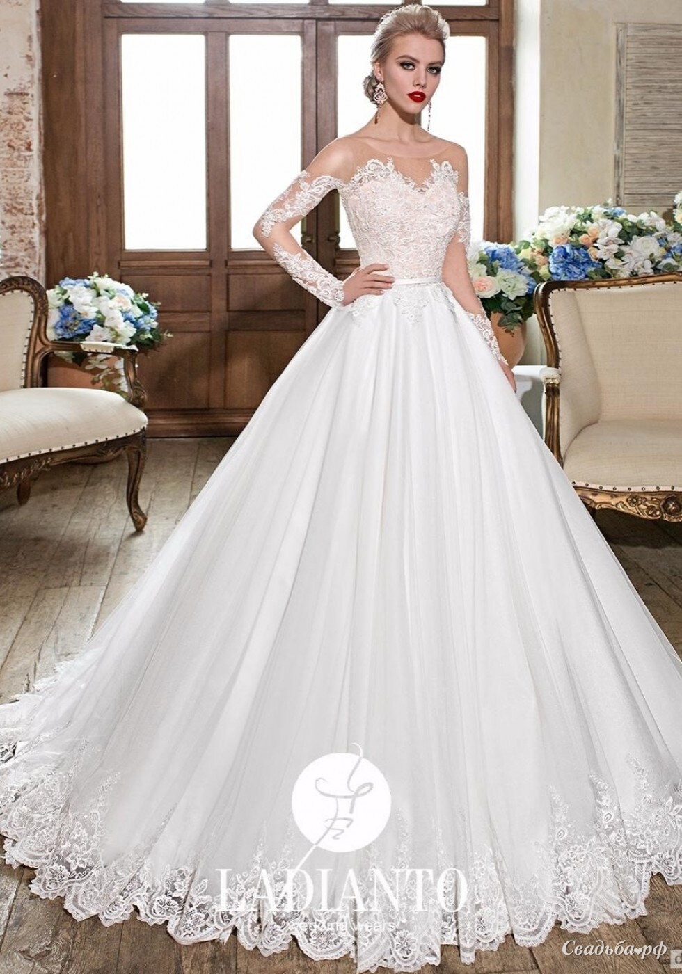 Роскошное свадебное платье в бальном стиле с оригинальными длинными рукавами. Корсет из нежнейшего кружева. Спинка открыта. На талии тонкий атласный поясок с бантиком. Пышная юбка из еврофатина переходит в небольшой шлейф.