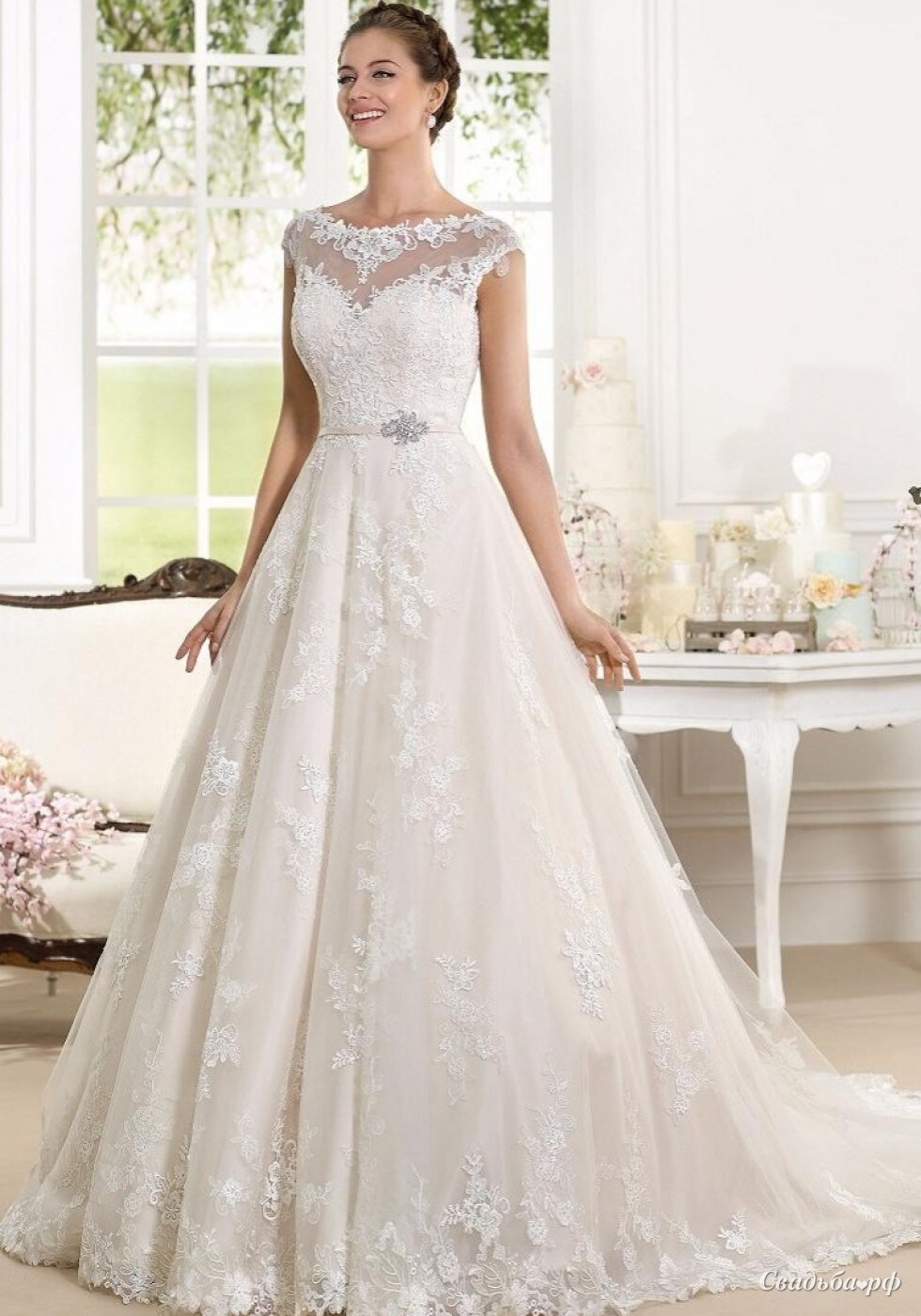 Восхитительное свадебное платье из прекрасного кружева. Такая модель А-силуэта выгодно подчеркивает все достоинства фигуры. На талии тонкий атласный пояс, украшенный сверкающей брошью. Благодаря таким эффектным элементам, как закрытая зона декольте и закрытая полупрозрачная спинка, невеста будет неотразима в своем женственном наряде!