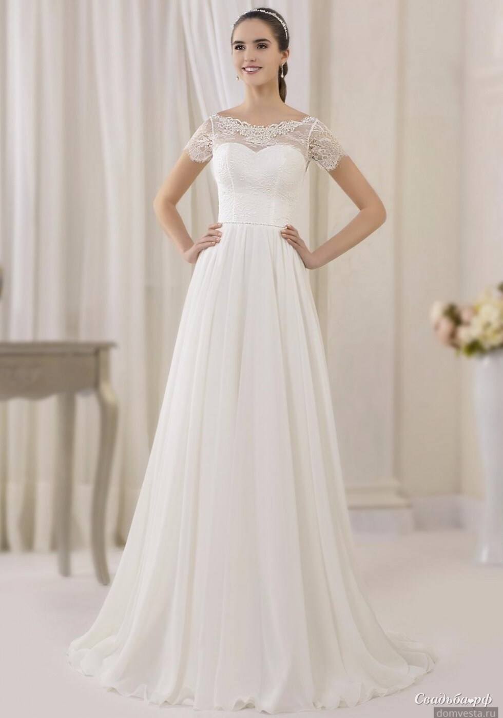 Свадебное платье для истинных ценительниц элегантности и простоты. Изящная модель идеально садится по фигуре и подчёркивает женственность. Зона декольте закрыта и дополнена небольшими полупрозрачными рукавчиками. Корсет украшен нежнейшим кружевом. На спинке оригинальный округлый вырез. Легкая юбка плавно струится до пола и переходит в небольшой шлейф.