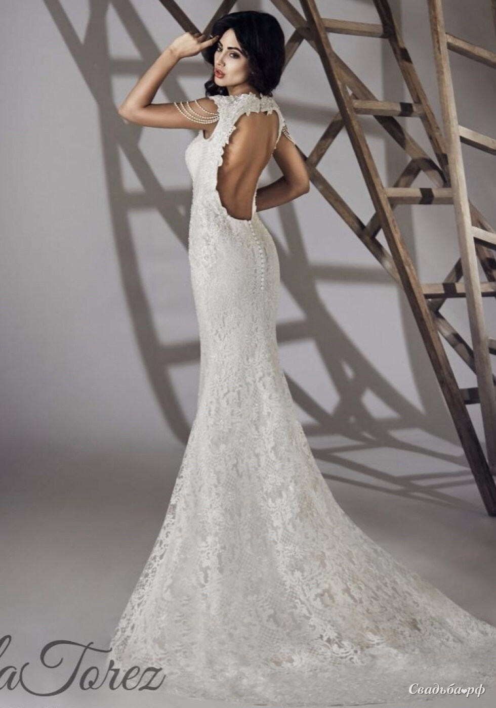 Оригинальное кружевное свадебное платье для приверженец изысканных нарядов. Шикарный корсет с глубоким декольте расшит жемчугом и бисером. Изюминкой модели являются нити жемчуга на плечиках, которые эффектно завершают образ. Облегающий силуэт великолепно подчеркивает фигуру.