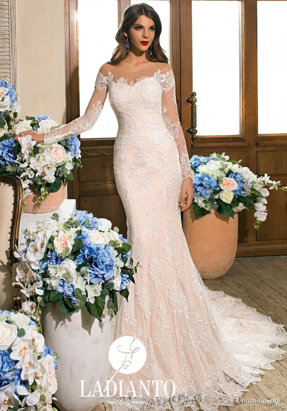 Шикарное свадебное платье из оригинального «венецианского» кружева, силуэт «рыбка». Длинные рукава с нежными пуговицами на манжетах дополняют корсет. Полупрозрачные плечи и спинка создают элегантный образ. Спинка декорирована красивыми маленькими пуговками.