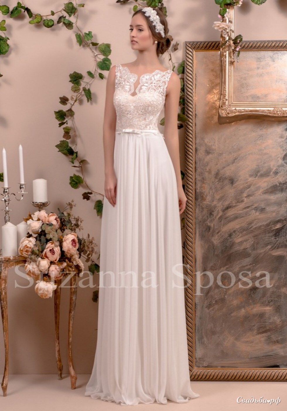 Красивое и недорогое свадебное платье в греческом стиле. Легкая шифоновая юбка красиво струится до самого пола, талия подчеркнута оригинальным поясом с бантиком. Спинка открытая, на шнуровке.