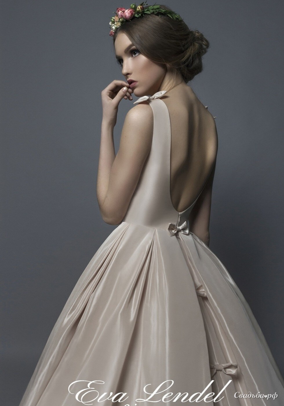 Стильное свадебное платье с открытой спинкой не обременено никаким излишним декором. Простой корсет дополнен широкими бретелями. Кокетливые бантики декорируют плечи, юбку и шлейф модели. В таком наряде невеста будет в центре всеобщего внимания!