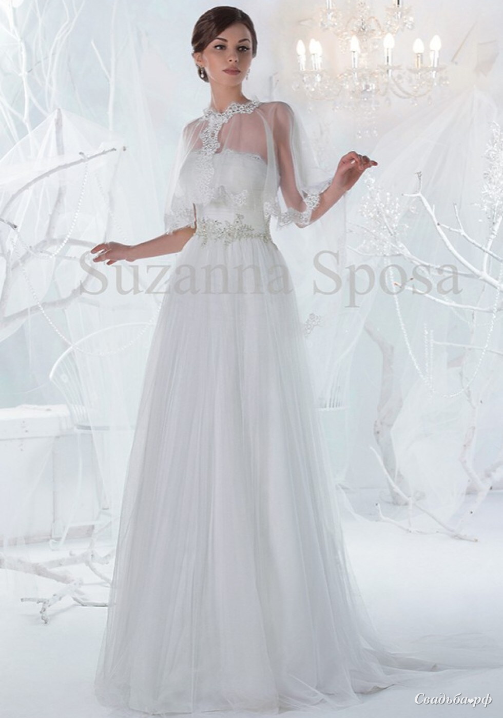 Недорогое свадебное платье А-силуэта из фатина. Лиф корсета украшен тонким кружевным кантом. Талия расшита веточками из страз и бисера. Корсет на шнуровке. Стоимость накидки 2500 руб.