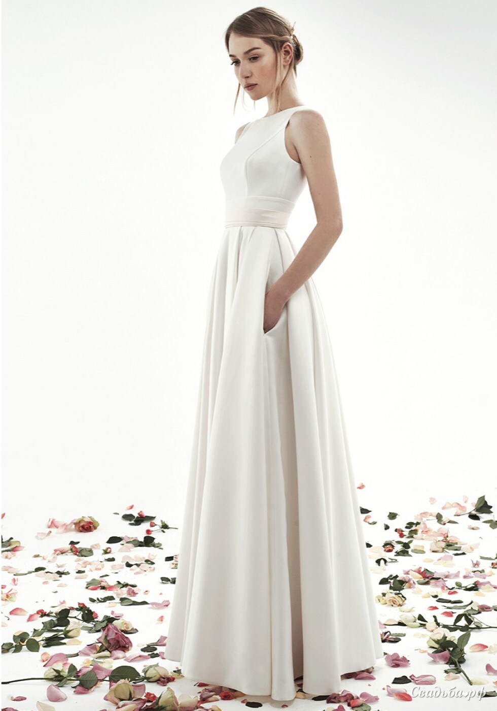 Атласное свадебное платье, в котором гармонично сочетается строгий стиль и невероятная женственность. Оно имеет обтягивающий лиф с закрытым декольте и прямую юбку со складками. Атласный пояс украшает талию.