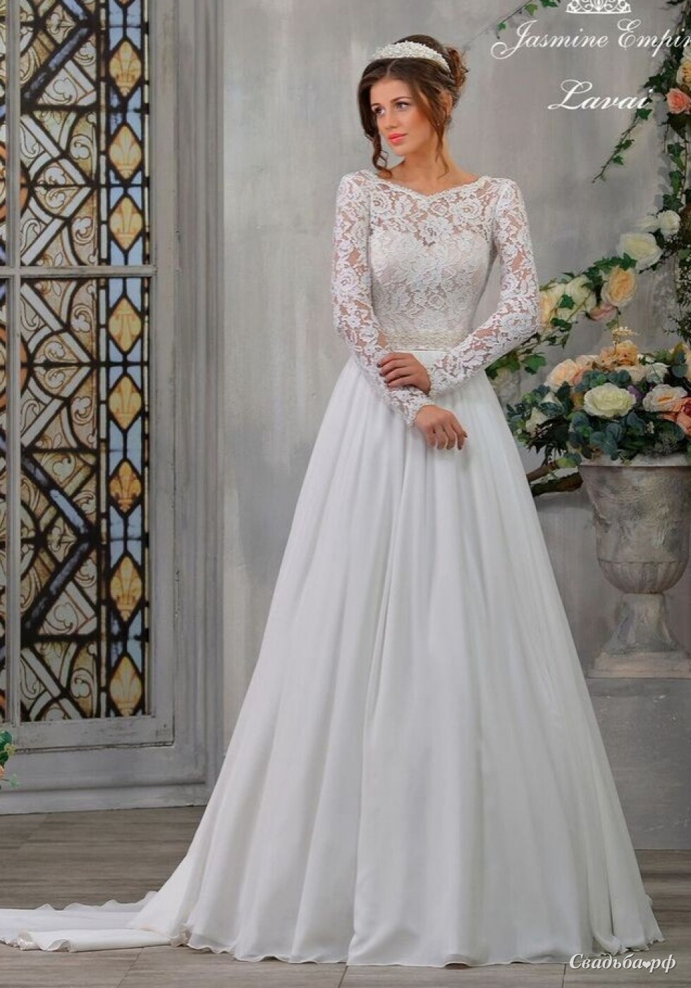 Очень нежное свадебное платье А-силуэта с небольшим шлейфом и с длинными рукавами. Корсет украшен эффектным кружевом с петельным узлом. Край горловины и манжеты рукавов расшиты жемчугом и стеклярусом. Талия выгодно подчеркнута атласным поясом с роскошным кружевом. Юбка с легкими складками завершает образ.