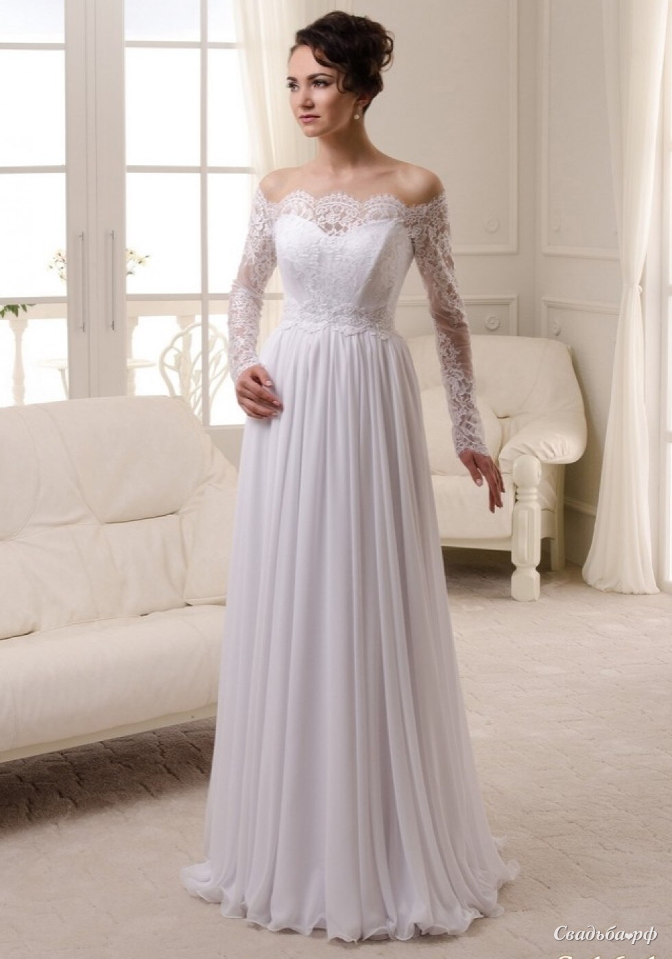 Легкое и нежное недорогое свадебное платье в греческом стиле из струящегося шифона создает незабываемый образ невесты. Корсет украшен эффектным кружевом, закрывающим зону декольте, спину и руки. Длинная юбка с завышенной талией струится до пола и переходит в небольшой шлейф.