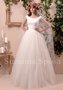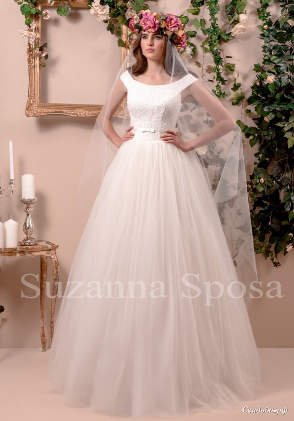 Недорогое свадебное платье А-силуэта. Корсет дополнен элегантными, чуть приспущенными бретелями средней ширины. Красивая фатиновая юбка струится до пола. Талия подчеркнута тонким пояском с маленьким бантом.