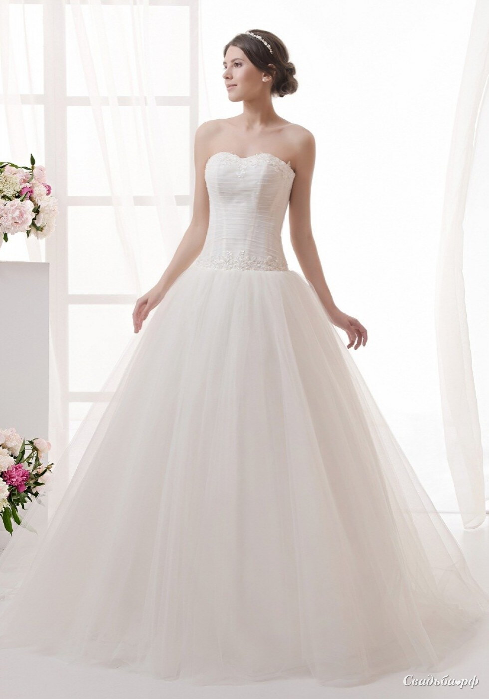 Пышное недорогое свадебное платье с открытым верхом выгодно подчеркивают фигуру. Заниженный корсет задекорирован легкими складками и расшит сверкающими пайетками по лифу и по линии талии. Объемная юбка из фатина придает образу королевский шик.