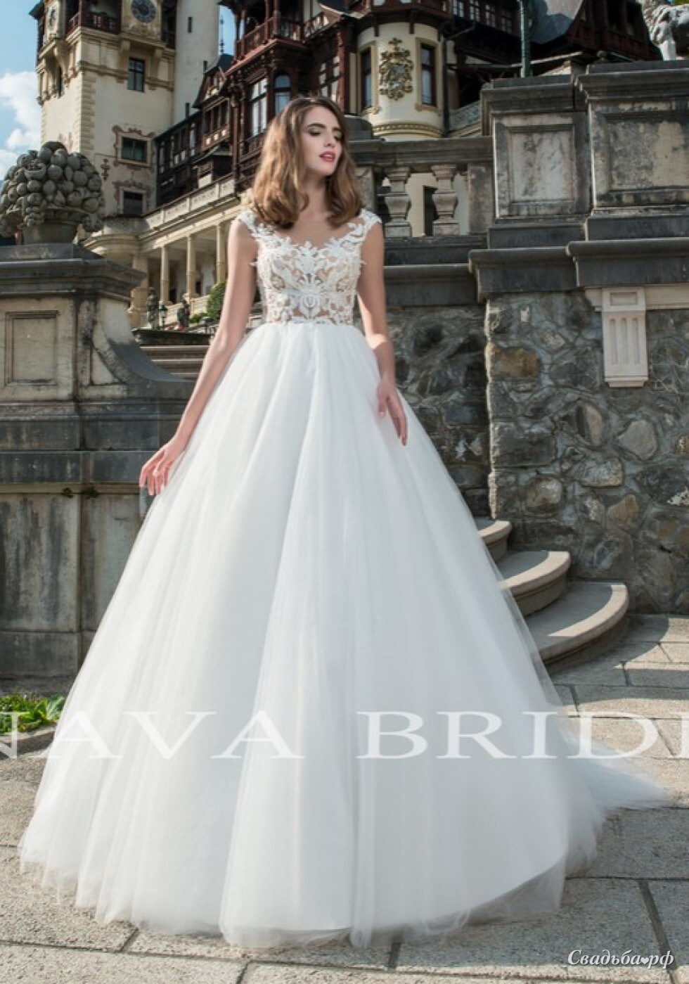 Красивое свадебное платье с пышной юбкой и красивым кружевным верхом.