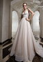 Оригинальное свадебное платье А-образного силуэта с необычным дизайном. Модель полностью выполнена из сетчатого кружева. Верх модели дополнен неширокими бретелями и эффектным V-образным вырезом, аналогичные вырезы расположены по бокам и на спинке, все они отделаны расшивкой крупными кристаллами Swarovski. Платье застегивается на молнию. Талия красиво подчеркнута имитированным поясом с двойной линией расшивки.
