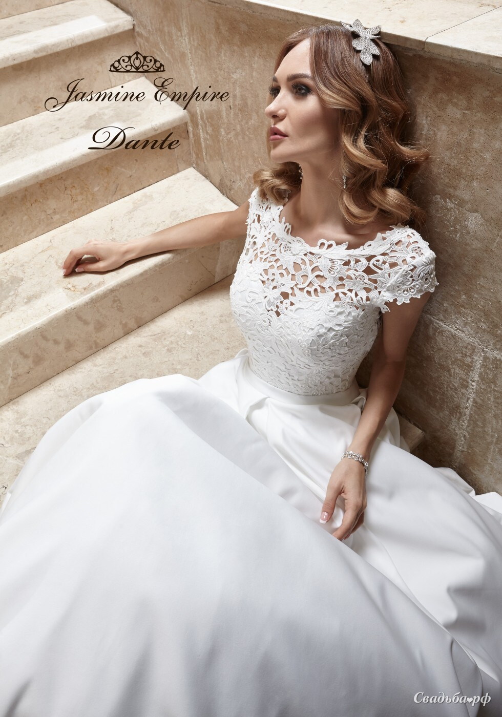 Классическое свадебное платье А-образного силуэта. Верх модели выполнен из бархатного кружева и дополнен небольшими рукавами, вырез лифа в форме сердца. Талия подчеркнута нешироким атласным поясом. Спинка открыта, на шнуровке. Длинная юбка из атласа имеет длину до пола.