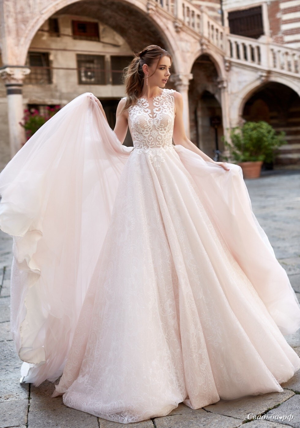 Оригинальное свадебное платье А-образного силуэта. Верх модели выполнен из кружева с цветочным орнаментом, дополнен неширокими бретелями и эффектным V-образным вырезом. Спинка закрыта, но пуговичной застежке. По бокам и на спинке телесное полупрозрачное кружево создает эффект обнаженного тела.