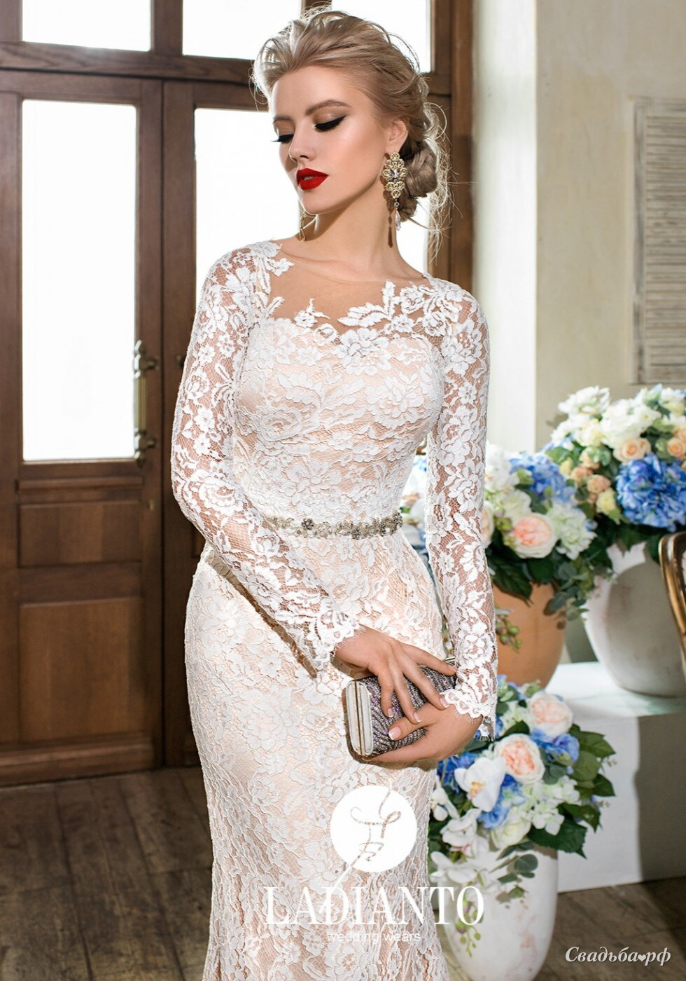 Элегантное свадебное платье прямого силуэта из кружева подчеркивает все достоинства фигуры. Модель дополнена длинными рукавами. Талия подчеркнута изысканным поясом, расшитым кристаллами Swarovski. Закрытая спинка декорирована маленькими пуговками. Пояс продается отдельно.