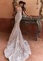 Свадебное платье силуэта рыбка с глубоким вырезом декольте. Спинка открытая, застежка-молния сбоку. Платье украшено бисером и пайетками.
