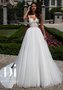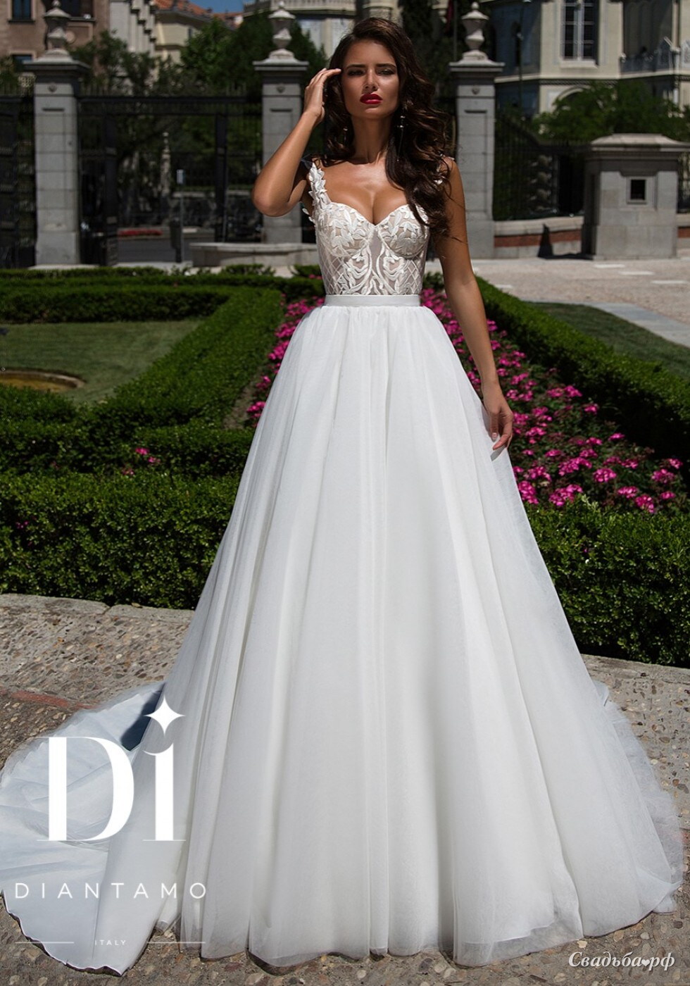 Эффектное свадебное платье А-образного силуэта. Разрез лифа выполнен в форме сердца, корсет дополнен неширокими бретелями и выполнен из красивого ленточного кружева. Спинка открыта, на шнуровке. Талия подчеркнута атласным поясом. Многослойная юбка из нежнейшего еврофатина дополнена небольшим шлейфом.