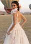 Свадебное платье А-силуэта с V-образным вырезом декольте и открытой спинкой на тонких бретелях. Лиф расшит бисером и бусинами, на юбке вышит цветочный орнамент из мелких пайеток.