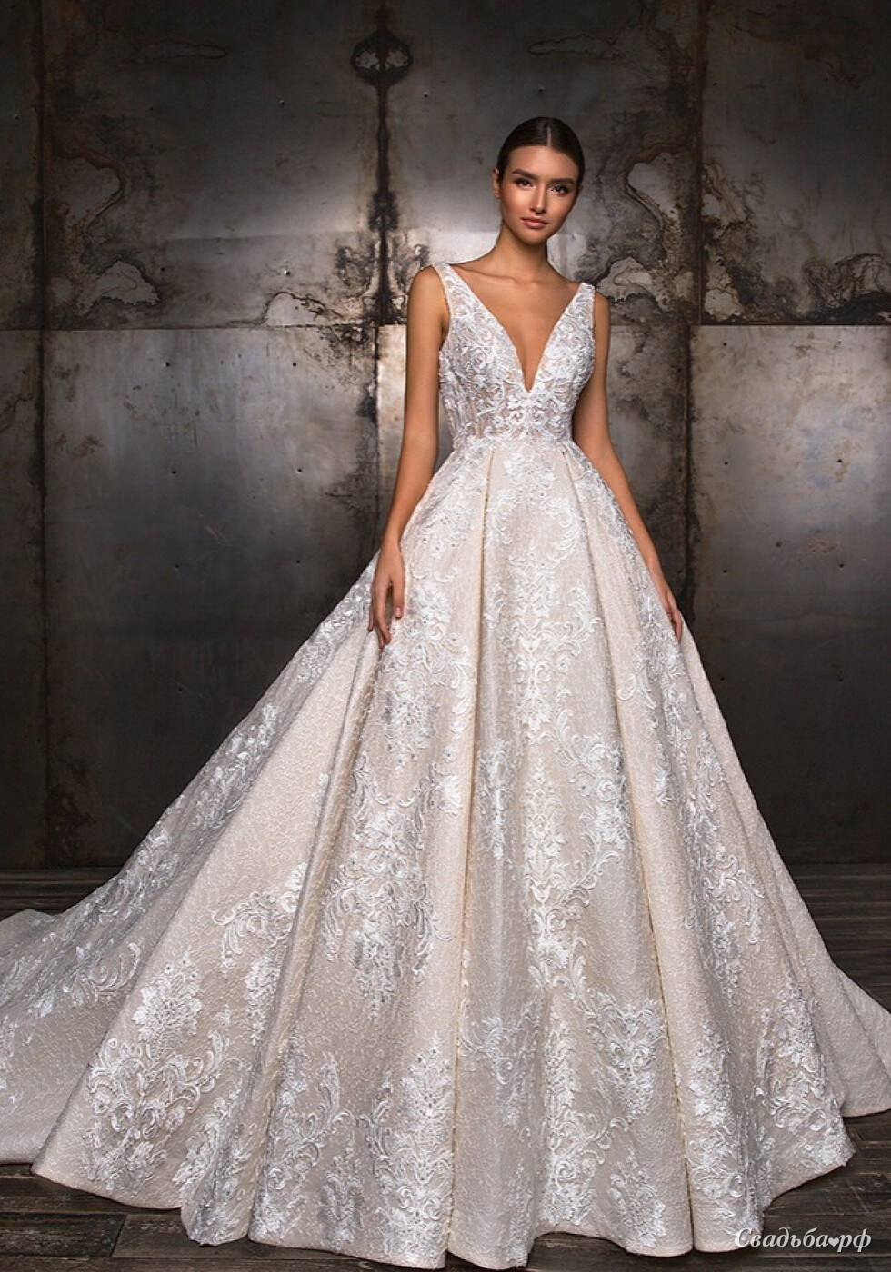 Нежное свадебное платье, полностью выполненное из кружева с крупным рисунком