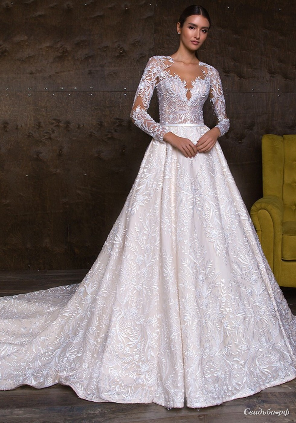 Классическое свадебное платье с полупрозрачными кружевными рукавами и эффектным вырезом.