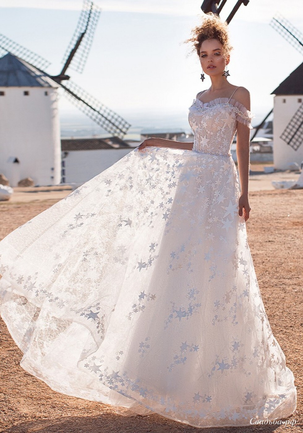Оригинальное свадебное платье А-образного силуэта. Модель отрезная по талии. Вырез лифа в форме сердца, верх модели дополнен тонкими бретелями, также корсет украшен более широкими приспущенными бретелями, декорированными рюшами и пайетками. Спинка открытая, на молнии. Модель полностью выполнена из гипюра с принтом в виде россыпи звезд.