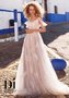 Свадебное платье А-образного силуэта с длинной юбкой, переходящей в небольшой шлейф. Верх модели дополнен тонкими и более широкими ниспадающими бретелями из тонкого кружева. Спинка открытая, на молнии. Модель полностью расшита кружевными аппликациями.