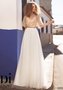 Свадебное платье А-образного силуэта. В зоне декольте глубокий V-образный вырез, верх выполнен из полупрозрачной сетки и активно расшит пайетками, дополнен широкими рукавами длиной до локтя. Спинка открыта. Талия акцентирована бархатным пояском. Длинная юбка выполнена из евросетки и дополнена небольшим шлейфом.