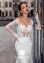 Полностью кружевное свадебное платье силуэта "рыбка". Корсет дополнен длинными рукавами, вырез лифа в форме сердца. Длинная юбка дополнена шлейфом. Спинка закрытая, на пуговичной застежке.