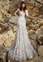 Элегантное свадебное платье силуэта "рыбка". Модель полностью расшита красивым кружевом с цветочным орнаментом. Верх дополнен глубоким V-образным вырезом в зоне декольте и длинными рукавами. Спинка открыта. Длинная юбка переходит в небольшой шлейф.