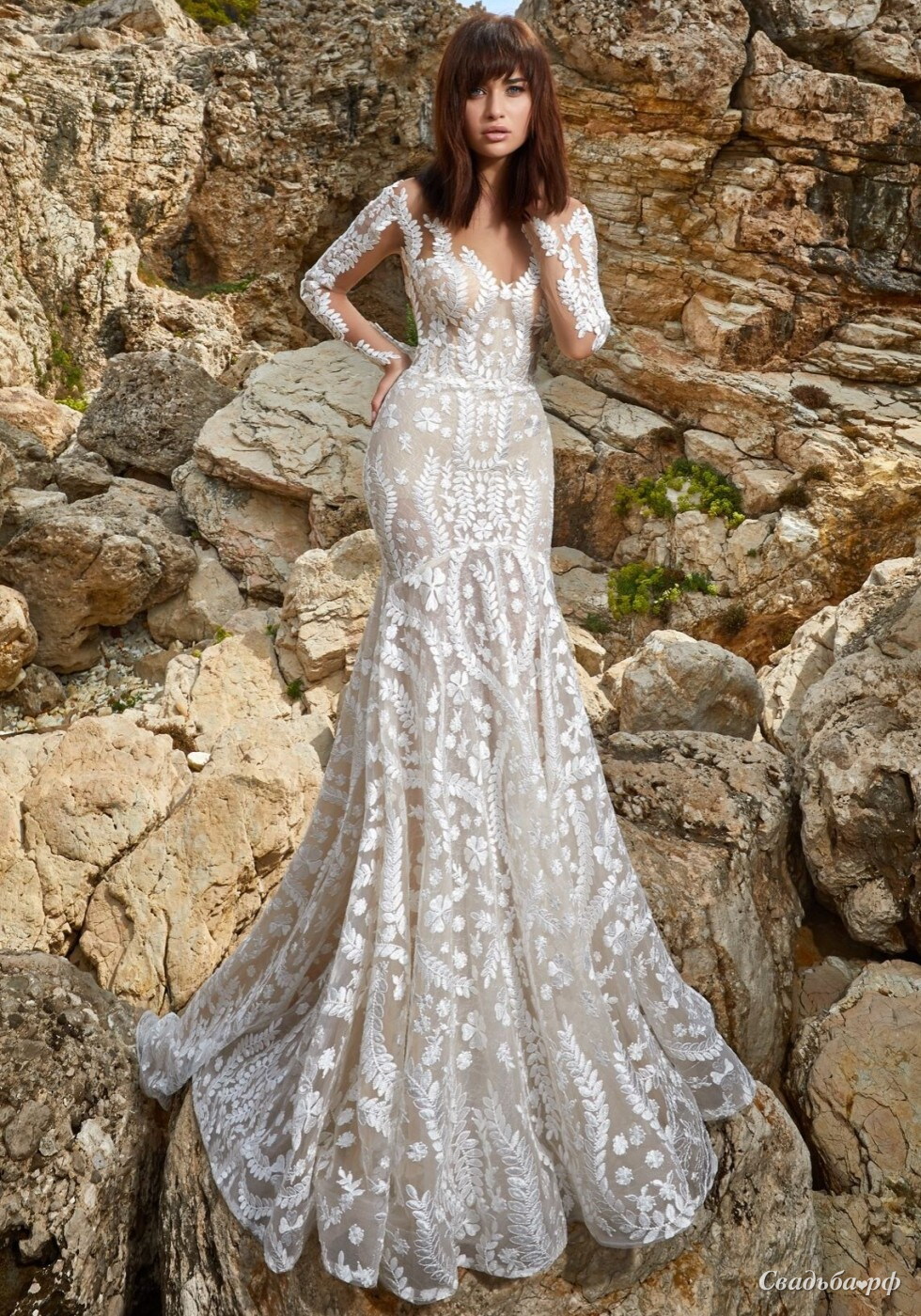 Элегантное свадебное платье силуэта "рыбка". Модель полностью расшита красивым кружевом с цветочным орнаментом. Верх дополнен глубоким V-образным вырезом в зоне декольте и длинными рукавами. Спинка открыта. Длинная юбка переходит в небольшой шлейф.