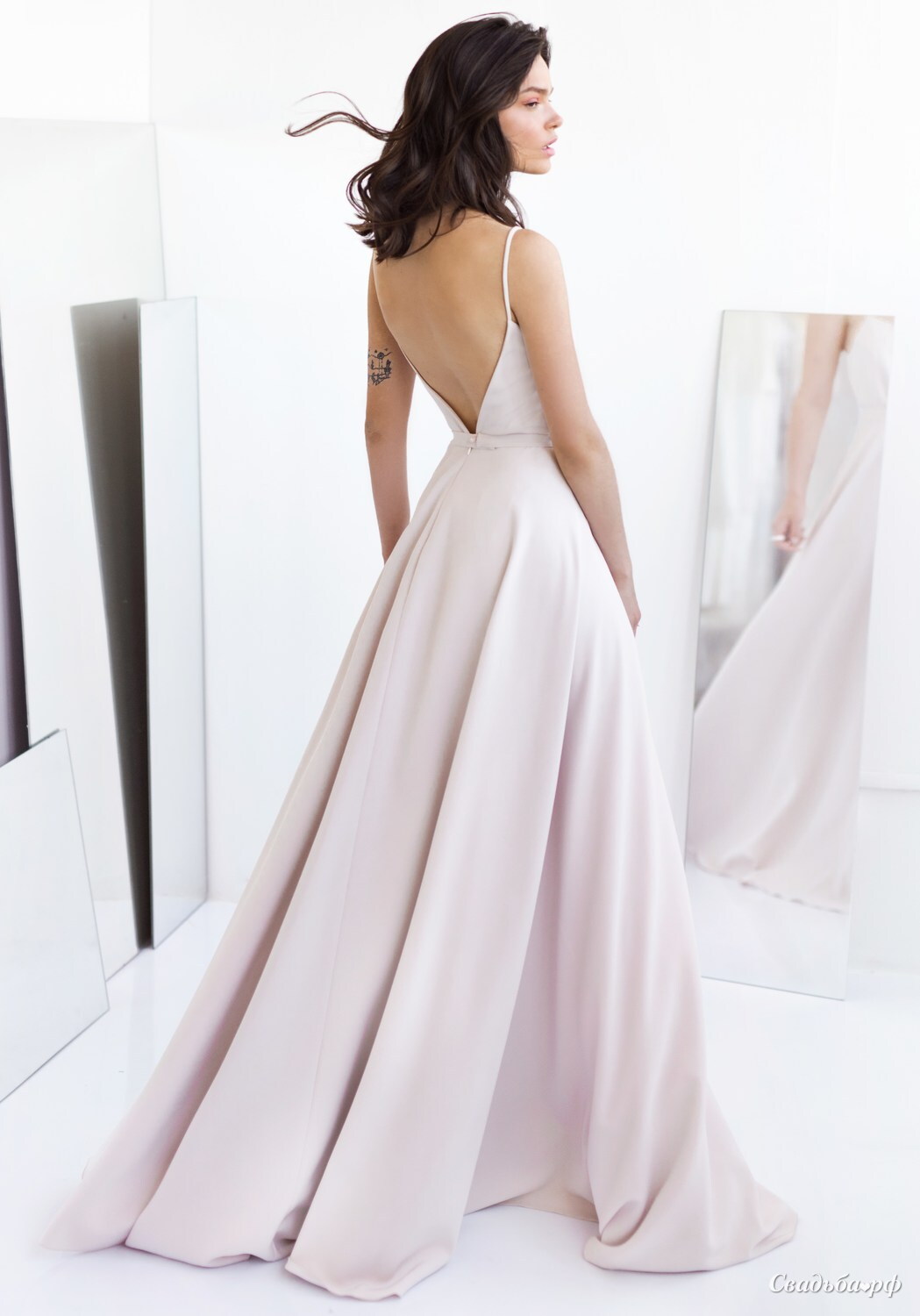 Свадебное платье в стиле бохо, без корсета, с открытой спиной и тонким пояском.