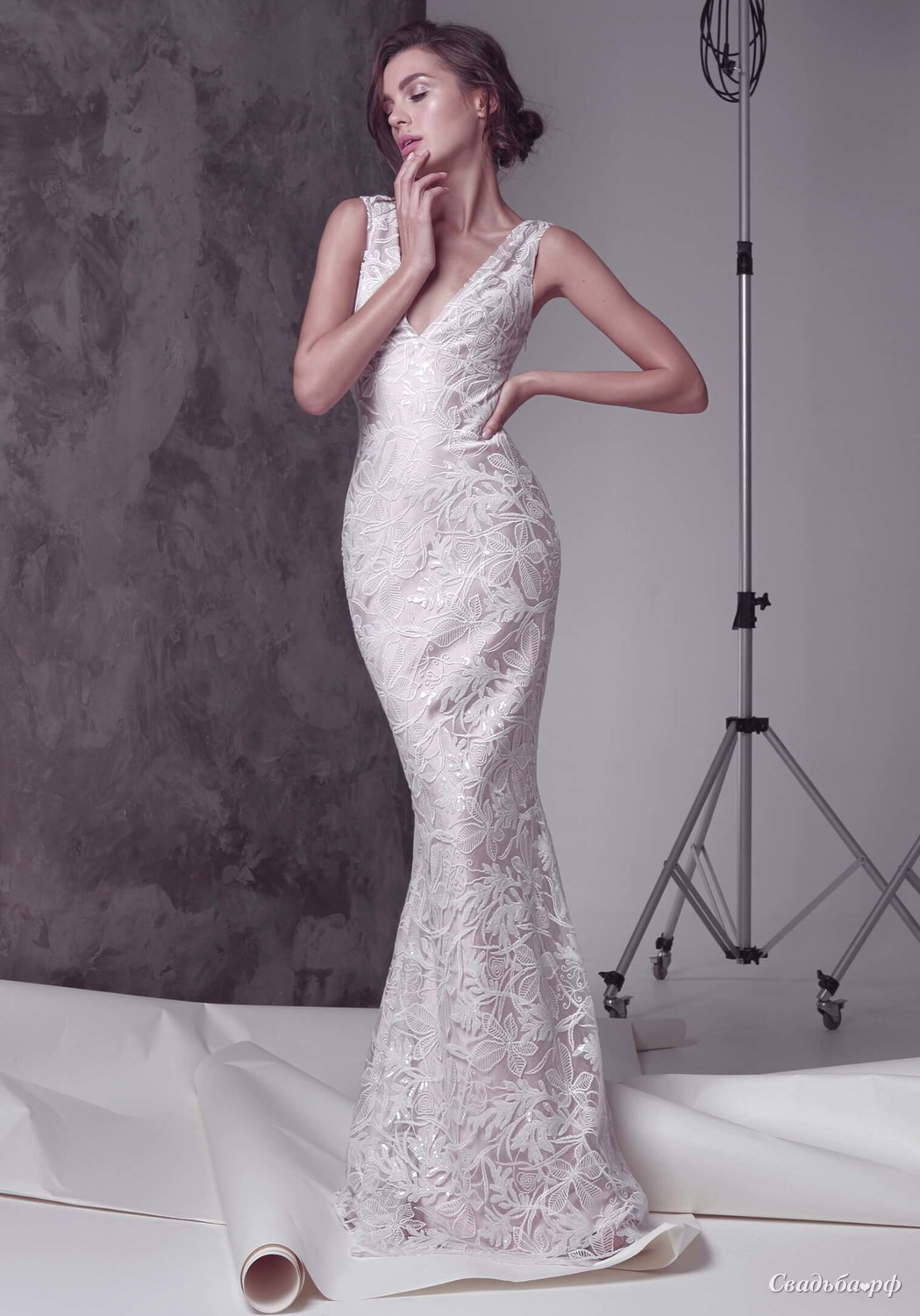 Свадебное силуэтное платье с V-образным вырезом. Атласное платье полностью расшито кружевом и полупрозрачными пайетками, что добавляет легкое мерцание. Кейп приобретается отдельно.