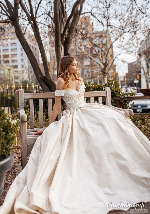 Пышное свадебное платье из жаккарда с приспущенными плечиками. Верх платья декорирован бисером и серебряной нитью, юбка переходит в длинный шлейф.