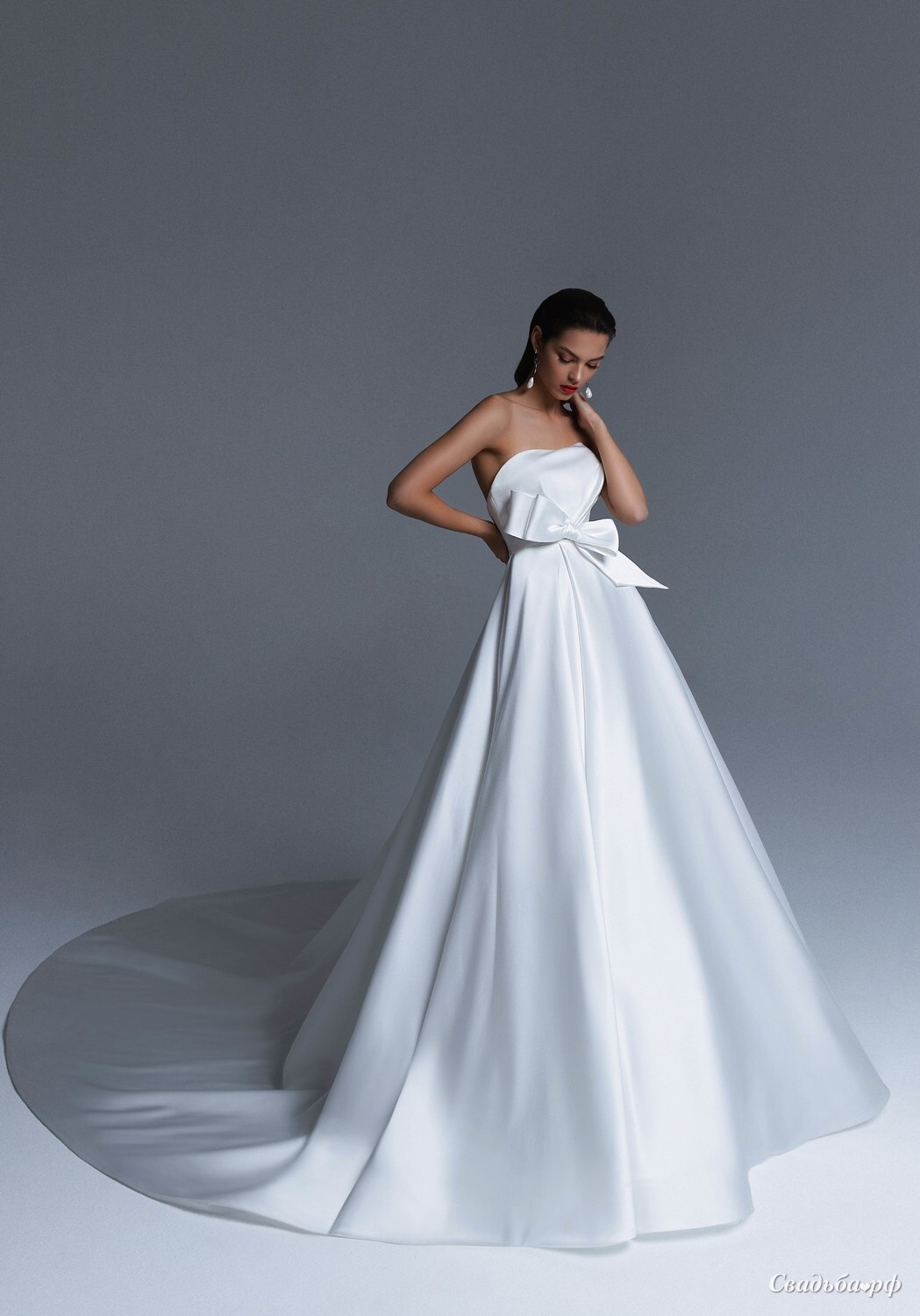 Свадебное платье А-силуэта выполнено из ткани атлас, юбка с карманами и длинным шлейфом. Корсет спереди прямой и украшен бантом.