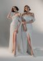 Роскошное платье облегающего силуэта с небольшим шлейфом и с разрезом, оголяющим одну ножку. Плечи приспущены.