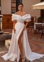 А-силуэтное свадебное платье со спущенной линией плеч, небольшим шлейфом и высоким разрезом вдоль ноги.